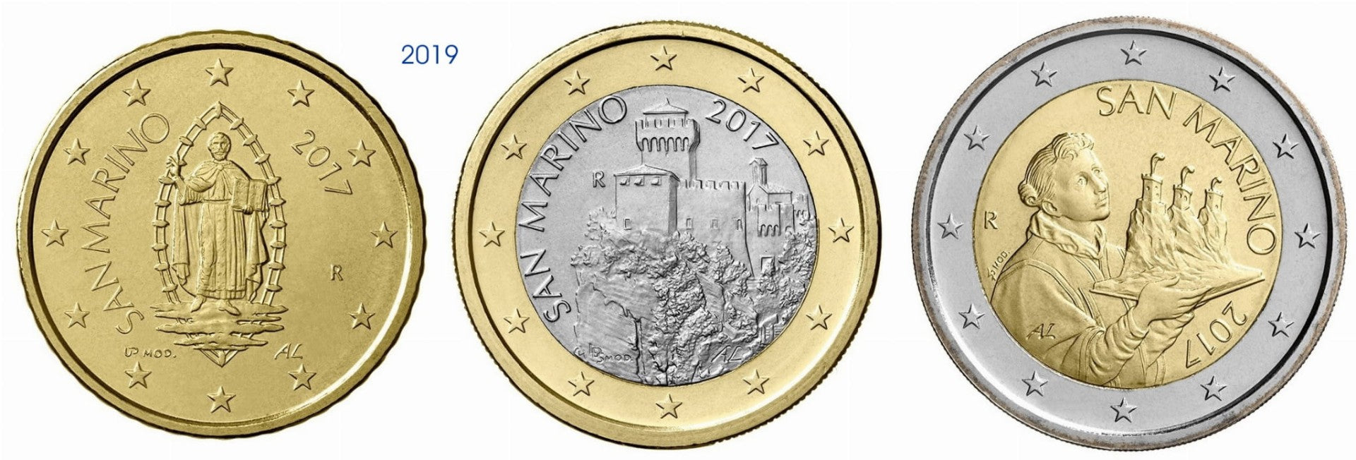 Druga seria: motywem monet 1, 2 i 5 centów są kolejno: herb Republiki San Marino, brama miejska i kościół św. Kwiryna.