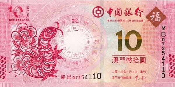 Makao 10 Pataca Rok Węża 2013 P-116a BOC