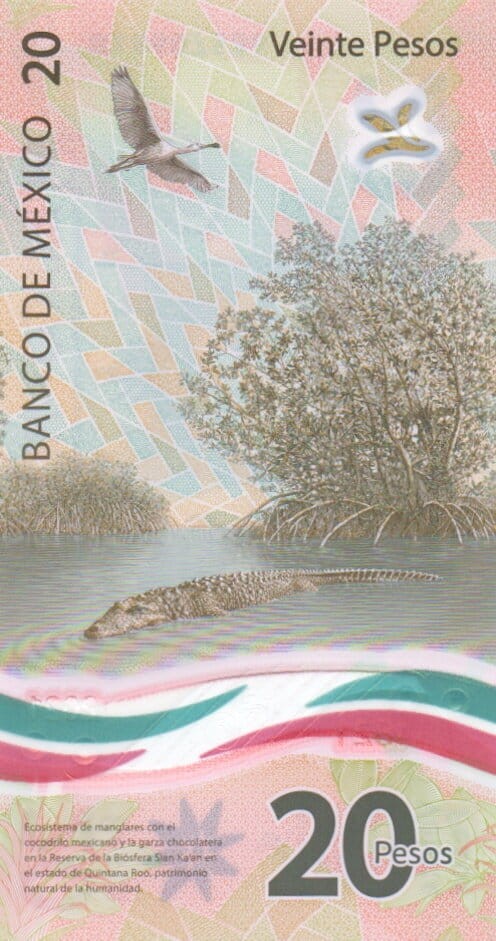 Rewers banknotu, zorientowany pionowo, przedstawia ekosystem namorzynowy z Rezerwatu Biosfery Sian Ka’an w stanie Quintana Roo, wpisanego na listę światowego dziedzictwa UNESCO. Ukazano tam krokodyla meksykańskiego (Crocodylus moreletii) oraz różowatego warzęcha (Platalea ajaja). W dolnej części znajduje się napis „Veinte Pesos”, a po prawej „Banco de México”.