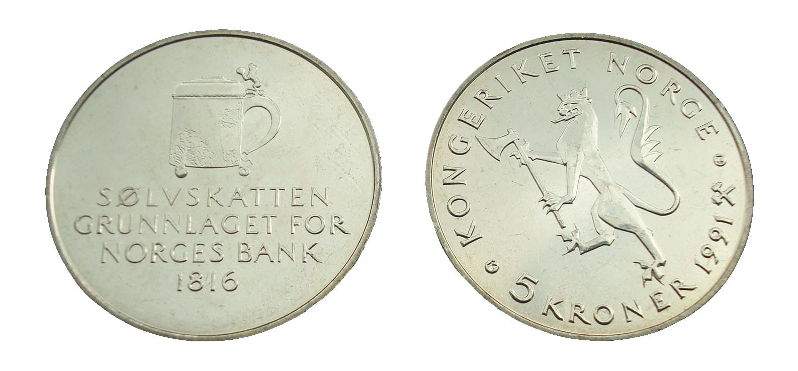 w centrum monety lew trzymający topór z herbu Norwegii; w górnym otoku: • KONGERIKET NORGE • (Królestwo Norwegii); w dolnym otoku nominał: 5 KRONER (koron) oraz rok wybicia: 1991