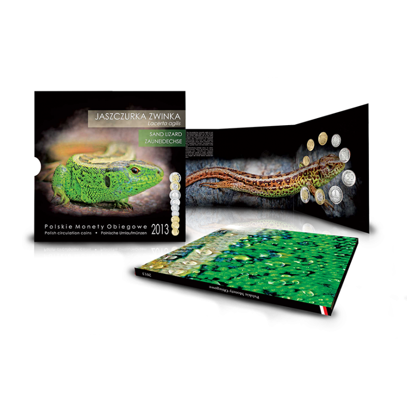 Monety obiegowe z 2013 roku (od 1 grosza do 1 złoty) i 2009 (2 zł i 5 zł) umieszczone w ekskluzywnym blistrze z Jaszczurką zwinką.