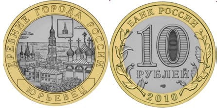 Awers: W centralnej części nominał 10 РУБЛЕЙ w otoczeniu roślinnego ornamentu. W cyfrze "0" ukryty wizerunek liczby 10 i oznaczenia rubla "РУБ" widoczny w zależności od kąta patrzenia. Pod spodem znak mennicy. Wzdłuż rantu na górze napis "БАНК РОССИИ", na dole rok wydania.