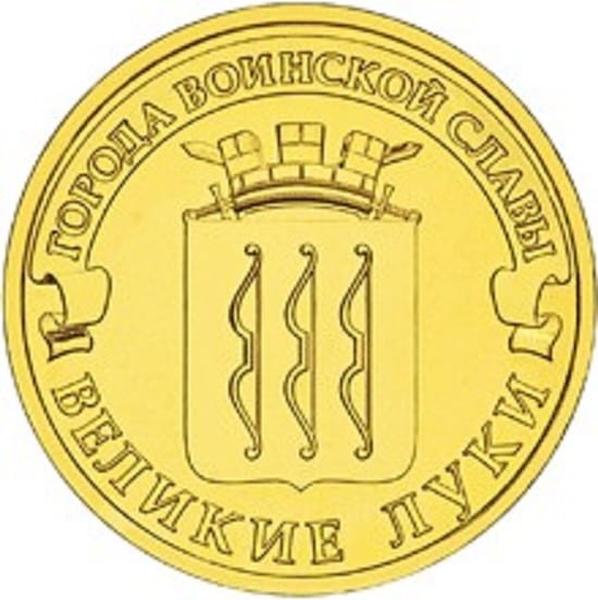 Na rewersie monety przedstawiono widok na miasto Wielkie Łuki, położone nad rzeką Łowatia, w obwodzie pskowskim. Miasto jest znane ze swojej historycznej twierdzy, która była ważnym punktem obronnym na granicy z Litwą i Polską. Na górze monety znajduje się napis "ВЕЛИКИЕ ЛУКИ" (Wielkie Łuki), a na dole - herb miasta.