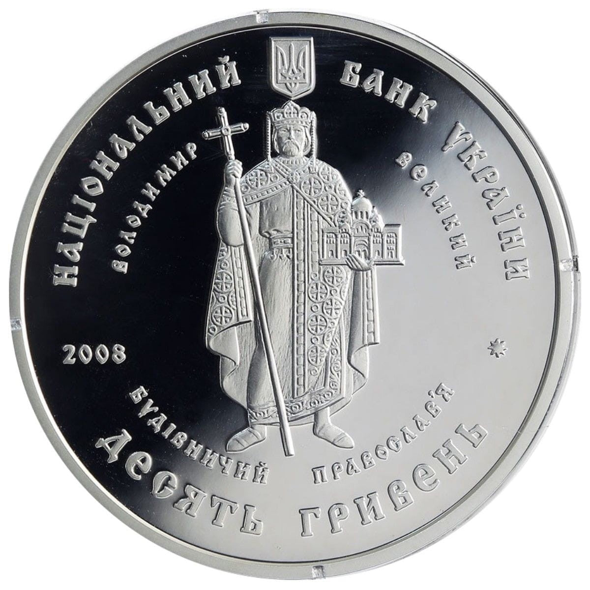 ДЕСЯТЬ ГРИВЕНЬ, po kole wewnętrznym БУДІВНИЧИЙ ПРАВОСЛАВ’Я. Po prawej stronie znak mennicy NBU, po lewej rok wydania 2008. Po środku monety kompozycja przedstawiająca wielkiego księcia Włodzimierza Światosławowicza. z krzyżem i modelem kościoła w dłoniach