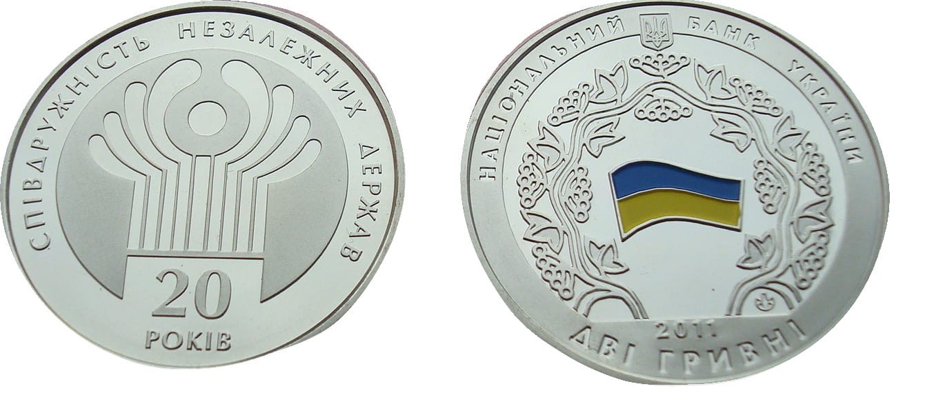 Rewers: Na górze wzdłuż rantu napis СПІВДРУЖНІСТЬ НЕЗАЛЕЖНИХ ДЕРЖАВ, na dole w dwóch rzędach 20/РОКІВ. Po środku kompozycja przedstawiająca logo Wspólnoty Niezależnych Państw.
