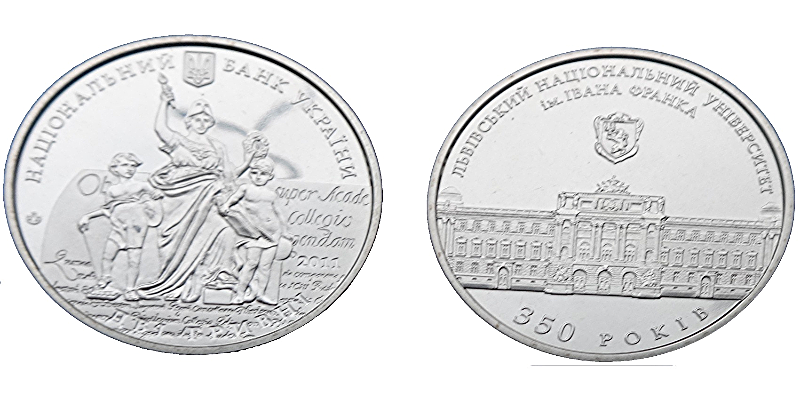 Opis: Moneta poświęcona jednemu z najstarszych uniwersytetów w Europie Wschodniej - uniwersytetowi im. Iwana Franki założonemu w 1661 roku we Lwowie. Uczelnia związana jest z działalnością wielu uczonych, szkół naukowych i przyczyniła się do rozwoju Ukrainy i świata w dziedzinie nauki i kultury.