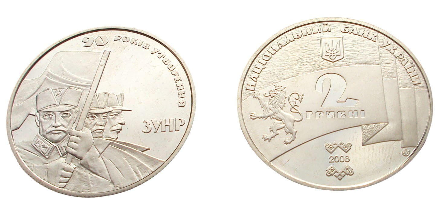 Awers: Na tle proporca na górze wzdłuż rantu napis НАЦІОНАЛЬНИЙ БАНК УКРАЇНИ, pod nim mały państwowy herb Ukrainy i nominał 2/ГРИВНІ. Po lewej lew z herbu ZUNR, poniżej między fragmentami ornamentu dekoracyjnego rok wydania 2008 i znak mennicy NBU.