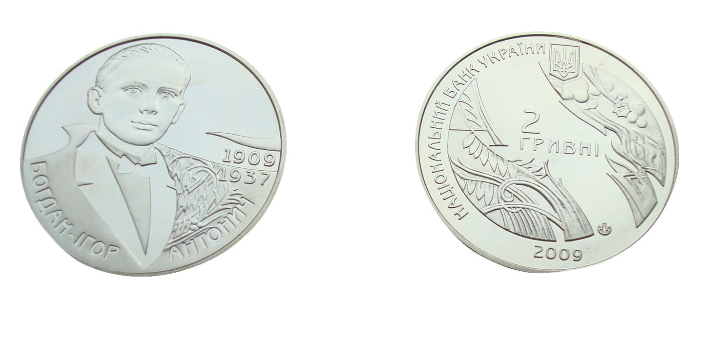Opis: Moneta poświęcona poecie-romantykowi Bogdanowi-Igorowi Antonyczowi (1909-1937), który wzbogacił literaturę ukraińską liryką filozoficzną, motywami religijnymi i kosmicznymi. Jego poezja odegrała wielką rolę w rozwoju współczesnego ukraińskiego modernizmu. Ze względu na cenzurę twórczość została rozpowszechniona szerzej dopiero w latach 60-tych XX w.