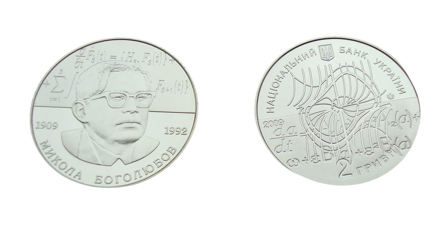 Opis: Moneta wydana z okazji 100 rocznicy urodzin Mykoły Bogolubowa - jednego z wybitnych matematyków i fizyków ukraińskich, który dał podstawy współczesnym gałęziom tych nauk.Uniwersytet Wrocławski i Uniwersytet Warszawski odznaczyły go tytułami doktora honoris causa. Jego imieniem nazwano Instytut Fizyki Teoretycznej przy Państwowej Akademii Nauk Ukrainy.