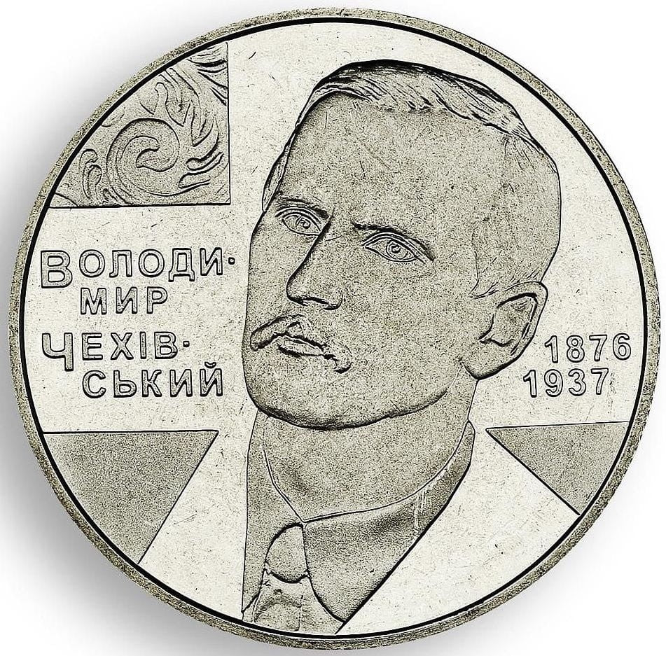 Rewers: portret W. M. Czechowskiego na tle stylizowanego krzyża oraz napisy ВОЛОДИ-/ МИР/ ЧЕХІВ-/ СЬКИЙ і lata życia - 1876/ 1937.