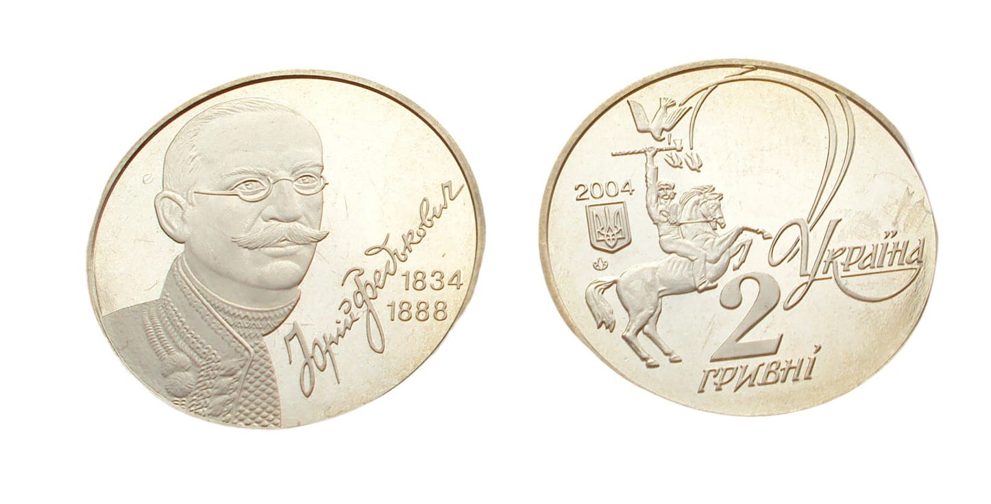 Awers: Kompozycja symbolizująca patriotyczny i heroiczno-romantyczny charakter twórczości J. Fedkowycza: jeździec trzymający w ręku proporzec, broniący jaskółek przed polującym na nie drapieżnym ptakiem. Na lewo od kompozycji rok wydania 2004, a pod nim mały państwowy herb Ukrainy i znak mennicy NBU. Po prawej zdobny napis w trzech rządkach УКРАЇНА, nominał – 2 ГРИВНІ.