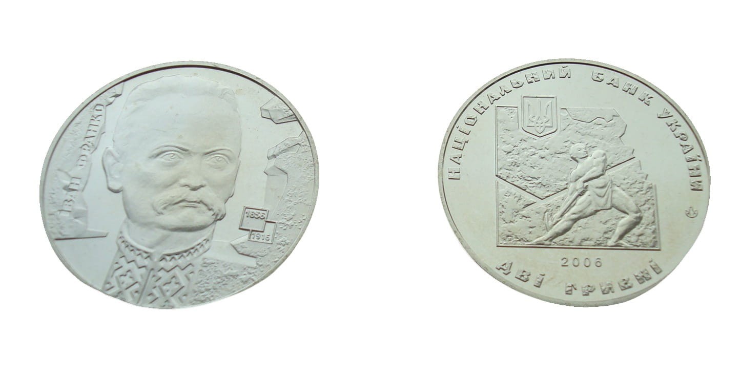Awers: Na górze mały herb państwowy Ukrainy. Na planie koła napisy: НАЦІОНАЛЬНИЙ БАНК УКРАЇНИ, 2 ГРИВНІ. Pod kompozycją (kamieniarz kujący skałę) rok wydania 2006, a po prawej stronie znak mennicy NBU.