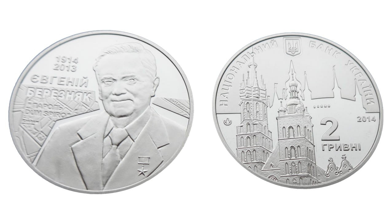 Opis: Moneta wydana z okazji 100-lecia urodzin Jewgienija S. Beriezniaka (ps. kapitan Michajłow) - Bohatera Ukrainy, wywiadowcy wojskowego Armii Czerwonej. Działał w okolicach Krakowa. Był autorem wielu naukowych prac, kandydatem nauk pedagogicznych.