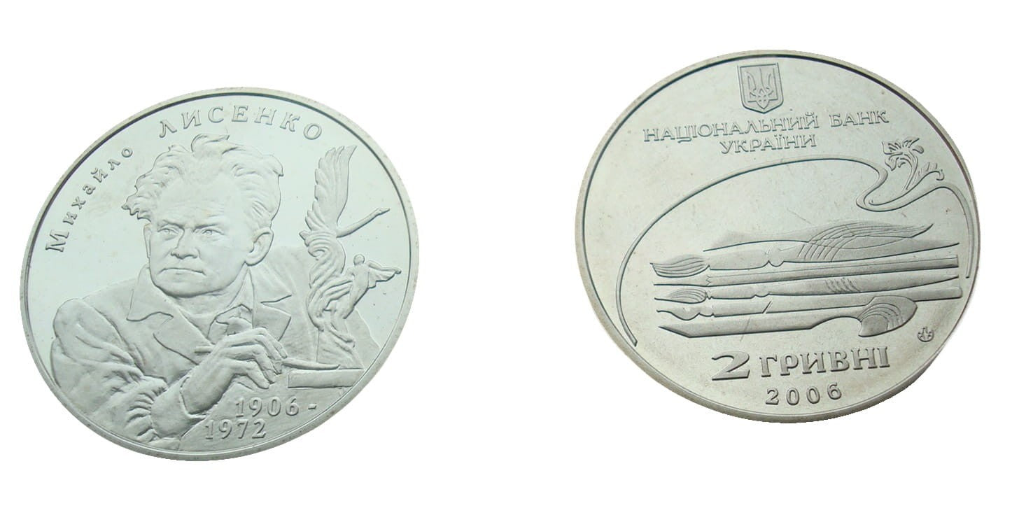 Awers: Na górze mały państwowy herb Ukrainy, pod nim napis w dwóch rządkach НАЦІОНАЛЬНИЙ БАНК/ УКРАЇНИ. Na tle palety przedstawiono narzędzia rzeźbiarza, malarza i grafika. Na dole napisy ДВІ ГРИВНІ/ 2006 oraz znak mennicy NBU.