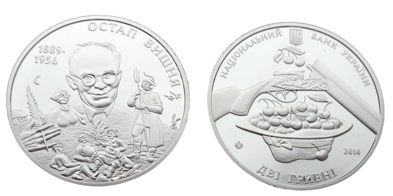 Awers: Na górze wzdłuż rantu napis НАЦІОНАЛЬНИЙ БАНК УКРАЇНИ przedzielony godłem państwowym. Na dole nominał ДВІ ГРИВНІ, a po jego obu stronach znak mennicy NBU (po lewej) oraz rok wydania 2014 (po prawej). Po środku kompozycja symbolizująca ulubiony przez Ukraińców zbiór utworów Wyszni "Вишневі усмішки" - rusznica strzelająca owocami wiśni oraz wypełniony wiśniami kapelusz.