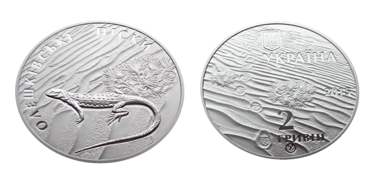 Opis: Moneta poświęcona jednemu z największych w Europie piaskowych nasypów i unikalnemu obiektowi przyrody - Piaskom Oleszkowskim w Obwodzie Chersońskim. Piaski zamieszkiwane są przez wiele rzadkich gatunków zwierzęcych i porośnięte są wieloma rzadkimi gatunkami roślinnymi, nierzadko endemicznymi i reliktowymi.