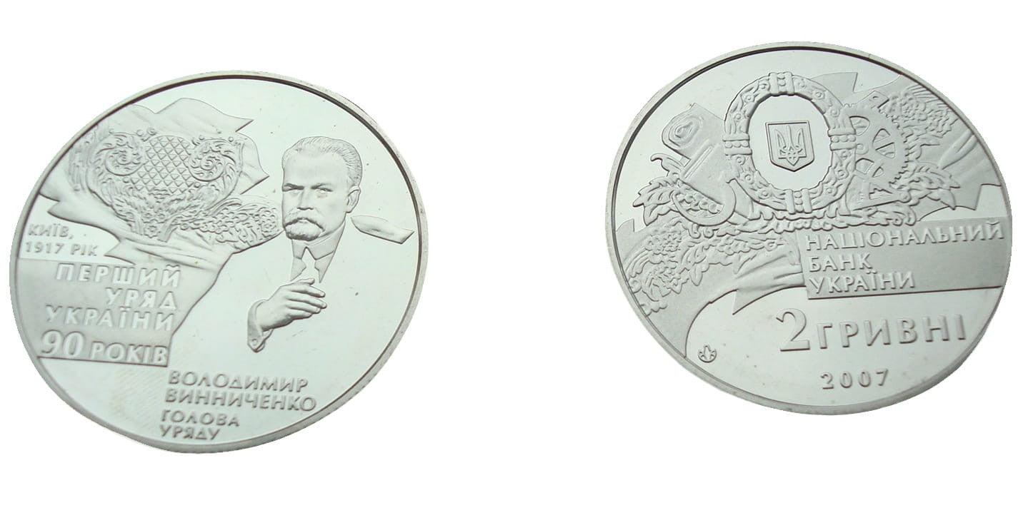 Awers: W kartuszu (ozdobnym obramowaniu) mały herb państwowy Ukrainy oraz kompozycja składająca się z fragmentów banknotów z tamtego okresu. Na banknotach przedstawiono atrybuty/symbole ówczesnych gałęzi przemysłu i kultury. Napisy:НАЦІОНАЛЬНИЙ / БАНК / УКРАЇНИ / 2 ГРИВНІ / 2007 oraz znak mennicy NBU.