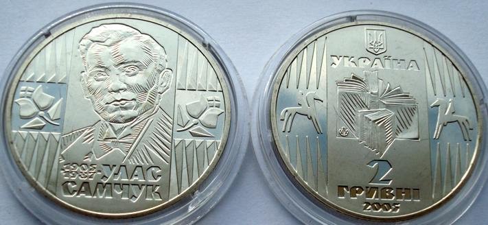 Ukrainy. Po środku stylizowany na pierwsze wydania utworów pisarza wizerunek książki, po bokach jakiej jeźdźcy konni. Na dole nominał 2, ГРИВНI i rok wydania 2005. Znak mennicy