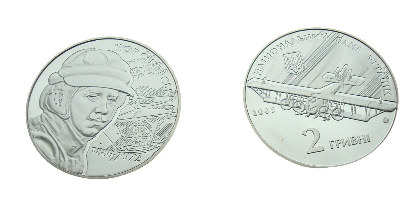 Awers: Kompozycja przedstawia samolot Ilja Muromiec. Na górze w półkolu napis НАЦІОНАЛЬНИЙ БАНК УКРАЇНИ, pod spodem mały państwowy herb Ukrainy, rok wydania 2009.Na dole nominał 2 ГРИВНІ. Po prawej stronie znak mennicy NBU.