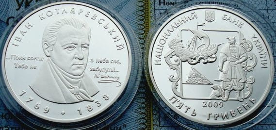 Moneta poświęcona Iwanowi P. Kotlarewskiemu (1769 – 1838) - wybitnemu pisarzowi, działaczowi społecznemu, pierwszemu klasykowi nowozytnej literatury ukraińskiej, autorowi Eneidy (trawestacja Wergiliusza), Natalki-Połtawki, Moskal-czariwnyk (wodewile).
