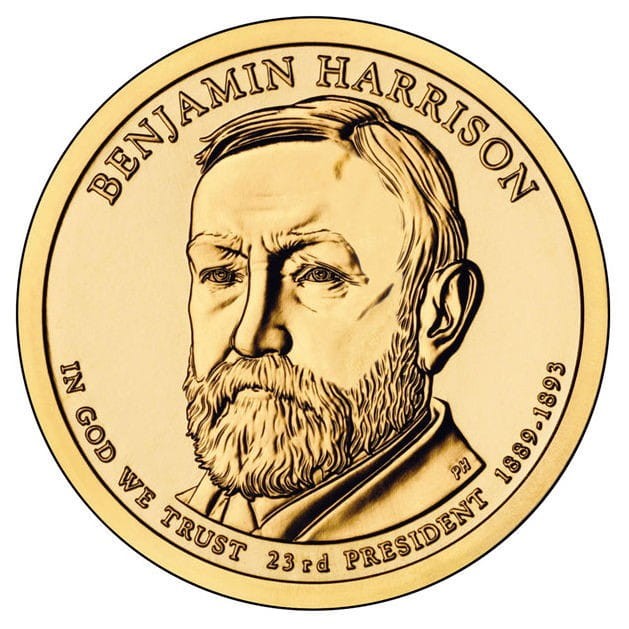 Description: Features an image of Benjamin Harrison with the inscriptions "BENJAMIN HARRISON", "IN GOD WE TRUST", "23rd PRESIDENT" and "1889–1893."