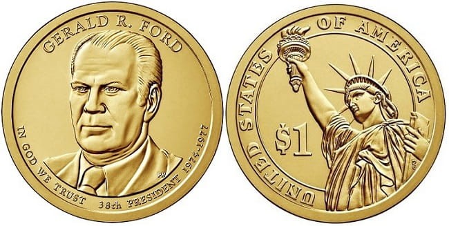 Description: Features a forward facing portrait of Gerald R. Ford. Inscriptions are "GERALD R. FORD," "IN GOD WE TRUST," "38th PRESIDENT" and "1974-1977."