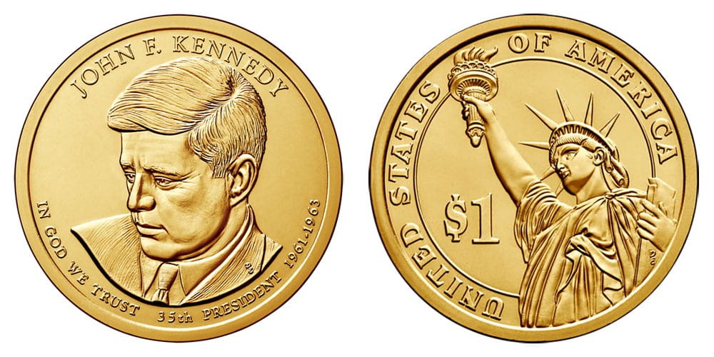 Description: Features a portrait of John F. Kennedy looking down, a pose reminiscent of that of his official White House portrait. Inscriptions are "JOHN F. KENNEDY," "IN GOD WE TRUST," "35th PRESIDENT" and "1961 – 1963."