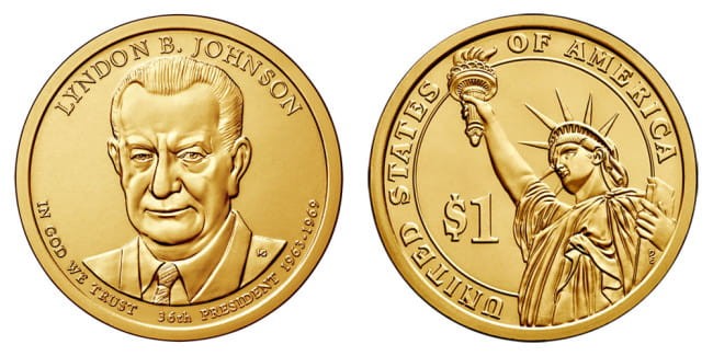Description: Features a forward facing portrait of Lyndon B. Johnson. Inscriptions are "LYNDON B. JOHNSON," "IN GOD WE TRUST," "36th PRESIDENT" and "1963 – 1969."