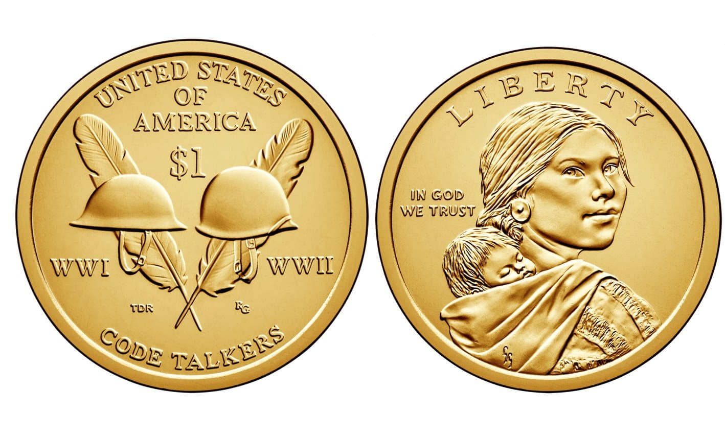 Description: The reverse design features two helmets with the inscriptions “WWI” and “WWII”, and two feathers that form a "V," symbolizing victory, unity, and the important role that these code talkers played. It includes the required inscriptions “UNITED STATES OF AMERICA” and “$1”.