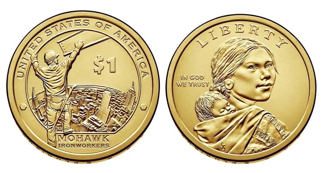 Description: The reverse design depicts a Mohawk ironworker reaching for an I-beam that is swinging into position, rivets on the left and right side of the border, and a high elevation view of the city skyline in the background. Inscriptions include Mohawk Ironworkers and the required inscriptions UNITED STATES OF AMERICA and $1.