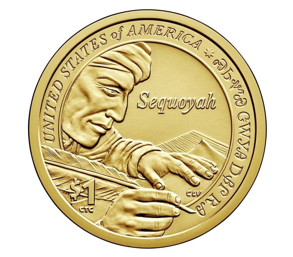 Description: The reverse design features a profiled likeness of Sequoyah writing “Sequoyah from Cherokee Nation” in syllabary along the border of the design. Inscriptions are “UNITED STATES OF AMERICA,” “$1” and “Sequoyah” written in English in the field of the design.