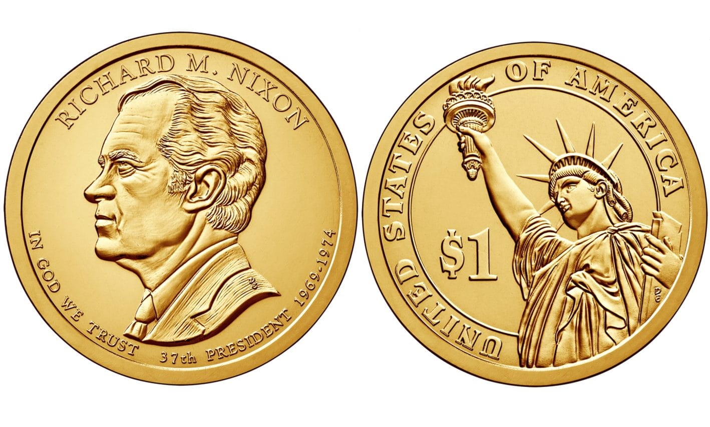 Description: Features a profile portrait of Richard M. Nixon. Inscriptions are "RICHARD M. NIXON," "IN GOD WE TRUST," "37th PRESIDENT" and "1969-1974."
