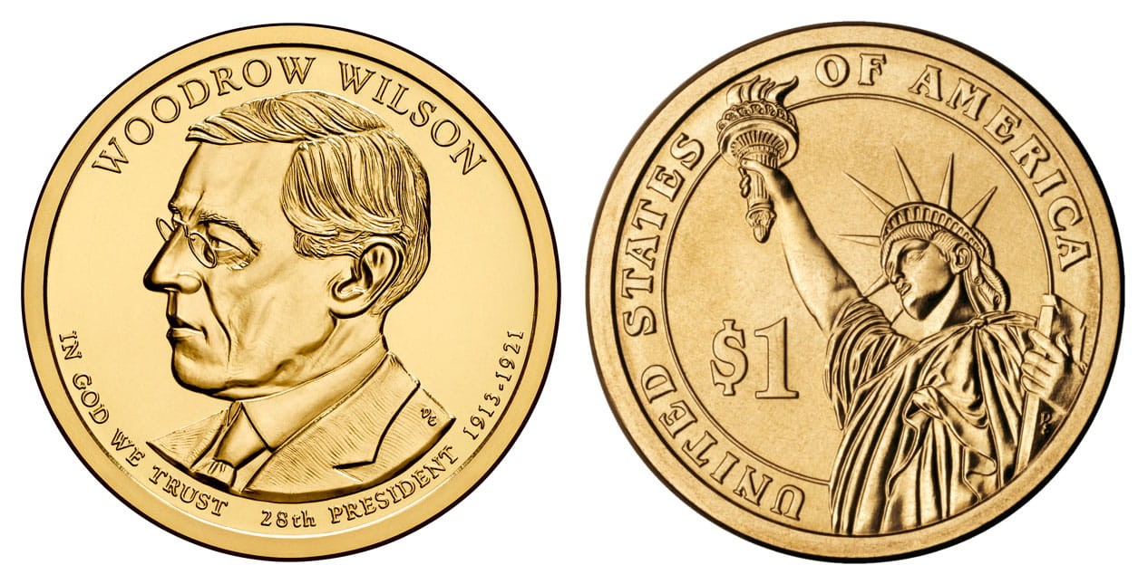 Description: Features an image of Woodrow Wilson with the inscriptions WOODROW WILSON, IN GOD WE TRUST, 28th PRESIDENT and 1913 - 1921.