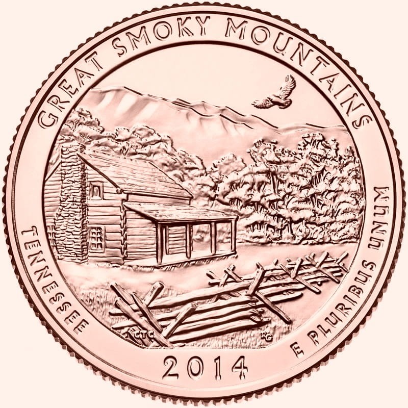 Description: depicts a historic log cabin found within Great Smoky Mountains National Park. It features a segment of the lush green forest and hawk circling above. Inscriptions are GREAT SMOKY MOUNTAINS, TENNESSEE, 2014 and E PLURIBUS UNUM.