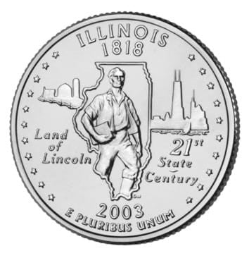 Depicts a young Abraham Lincoln within the outline of the state. A farm