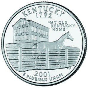 reads, "My Old Kentucky Home." A thoroughbred racehorse is positioned
