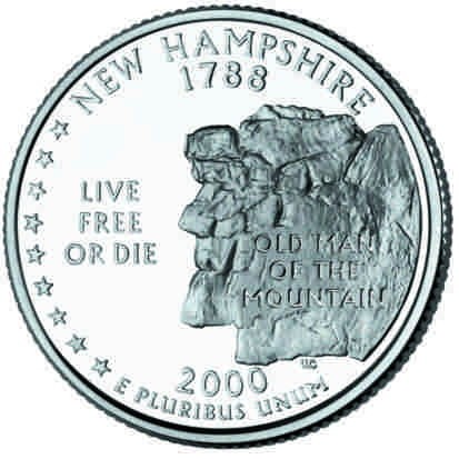Description: Depicts the rock formation, "The Old Man of the Mountain" and the state motto, "Live free or die".