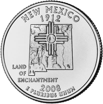 Rewers: a Zia sun symbol over a topographical outline of the State.