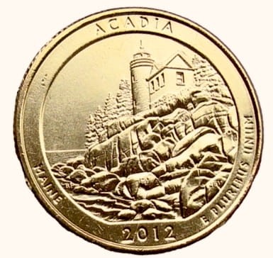 Description: Depicts a view of the Bass Harbor Head Lighthouse and Acadia's rough coastline. Inscriptions are ACADIA, MAINE, 2012 and E PLURIBUS UNUM.