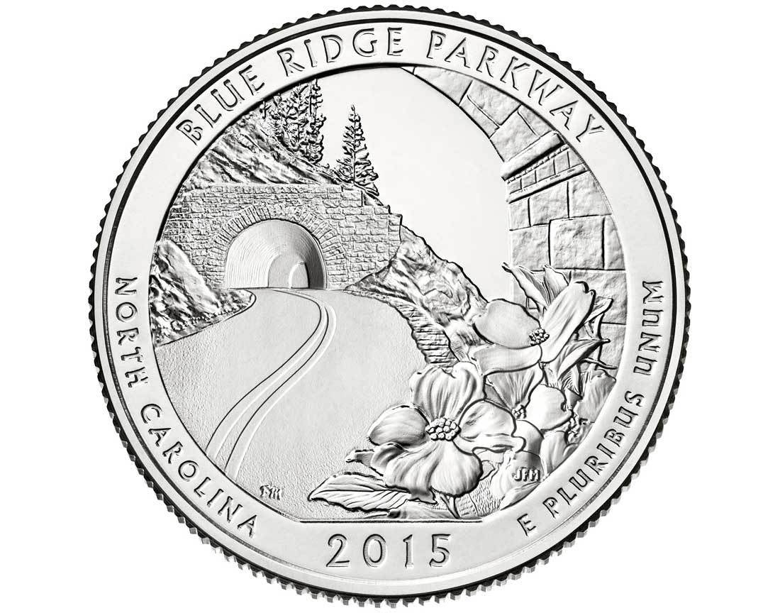 Description: depicts the grace and curvature of the road hugging the side of a mountain, with the North Carolina state flower in the foreground. Inscriptions are “BLUE RIDGE PARKWAY,” “NORTH CAROLINA,” “2015” and “E PLURIBUS UNUM.”