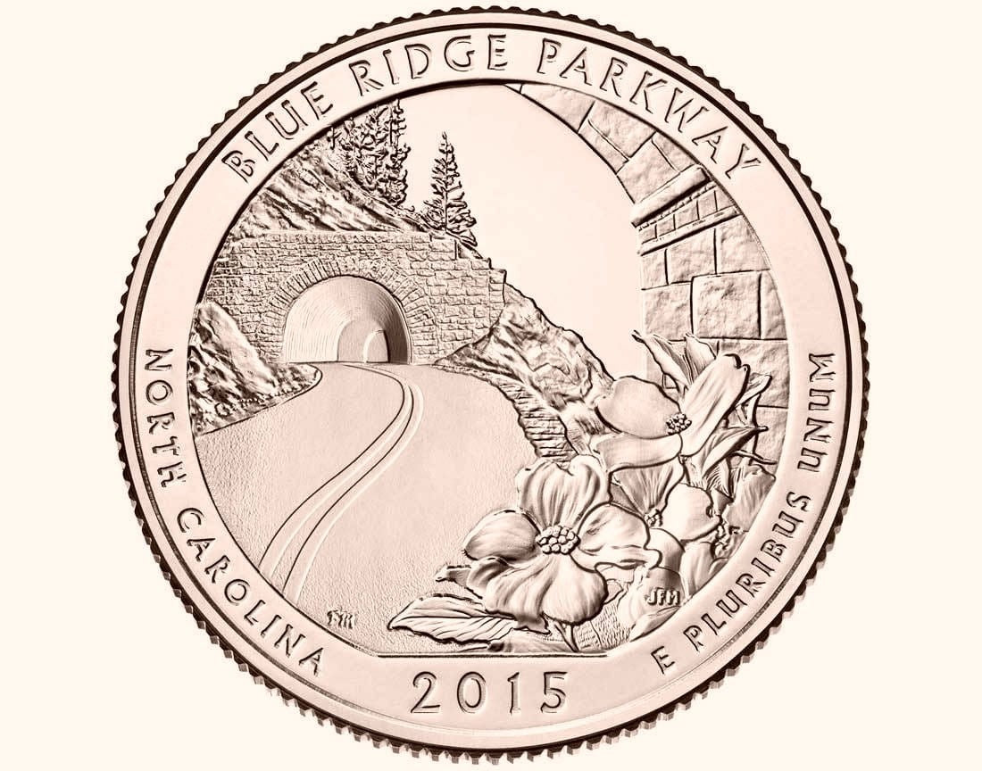 Description: depicts the grace and curvature of the road hugging the side of a mountain, with the North Carolina state flower in the foreground. Inscriptions are “BLUE RIDGE PARKWAY,” “NORTH CAROLINA,” “2015” and “E PLURIBUS UNUM.”