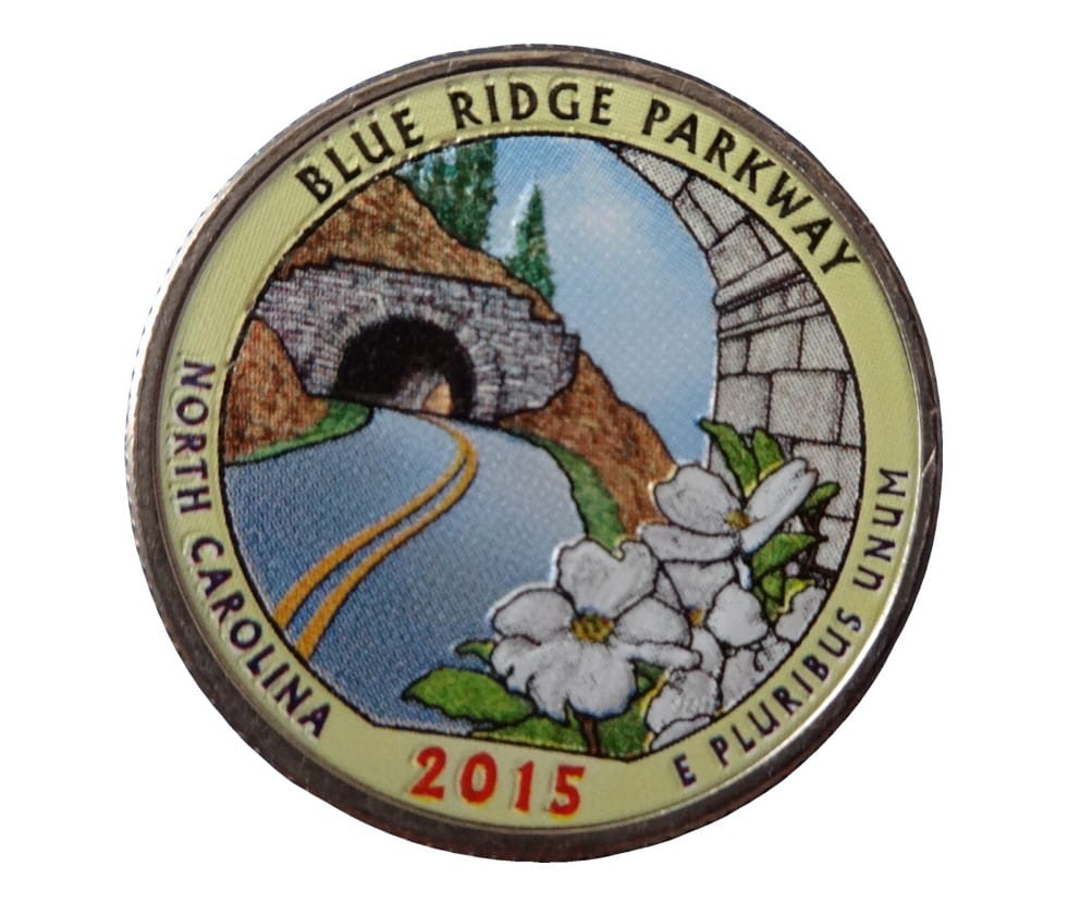 Description: depicts the grace and curvature of the road hugging the side of a mountain, with the North Carolina state flower in the foreground. Inscriptions are “BLUE RIDGE PARKWAY,” “NORTH CAROLINA,” “2015” and “E PLURIBUS UNUM.”