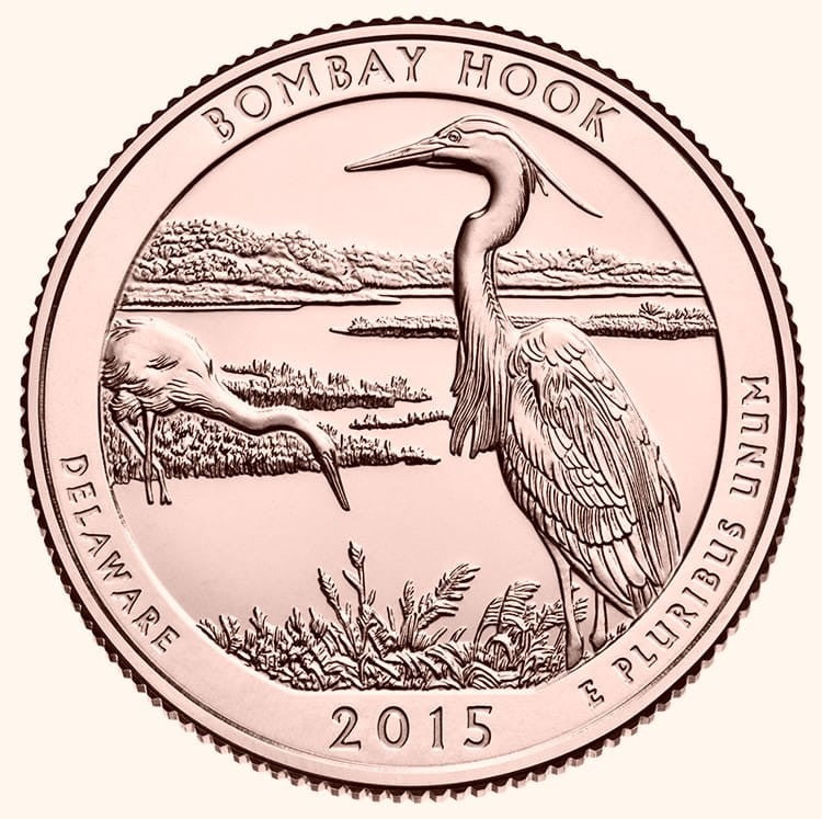 Description: features a great blue heron in the foreground and a great egret in the background. Inscriptions are “BOMBAY HOOK,” “DELAWARE,” “2015” and “E PLURIBUS UNUM.”