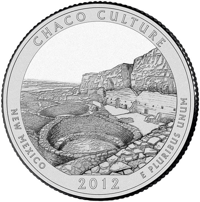 and the north wall of the canyon. Inscriptions are CHACO CULTURE, NEW MEXICO, 2012 and E PLURIBUS UNUM.