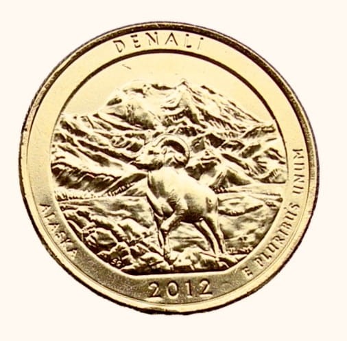 Description: Features a Dall sheep with Mount McKinley rising in the background. Inscriptions are DENALI, ALASKA, 2012 and E PLURIBUS UNUM.