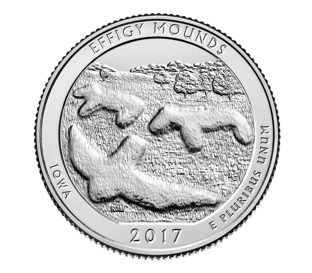 Description: depicts an aerial view of mounds in the Marching Bear Group. Inscriptions are “EFFIGY MOUNDS,” “IOWA,” “2017,” and “E PLURIBUS UNUM.”