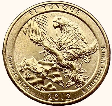 Description: Depicts a Coqui tree frog sitting on a leaf and a Puerto Rican parrot behind an epiphyte plant with tropical flora in the background. Inscriptions are EL YUNQUE, PUERTO RICO, 2012 and E PLURIBUS UNUM.