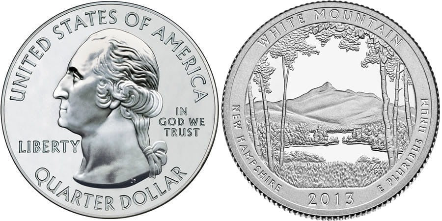 Description: Depicts Mt. Chocorua, the easternmost peak of the Sandwich Range, framed by birch trees. Inscriptions are WHITE MOUNTAIN, NEW HAMPSHIRE, 2013 and E PLURIBUS UNUM.