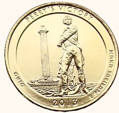 Description: Depicts the statue of Master Commandant Oliver Hazard Perry with the Peace Memorial located in the distance. Inscriptions are PERRY'S VICTORY, OHIO, 2013 and E PLURIBUS UNUM.