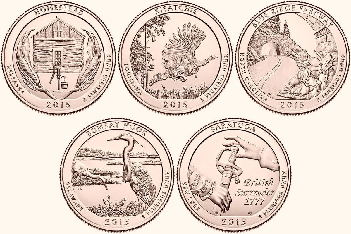 USA 25 c Parki narodowe x5 2015 platerowane złotem